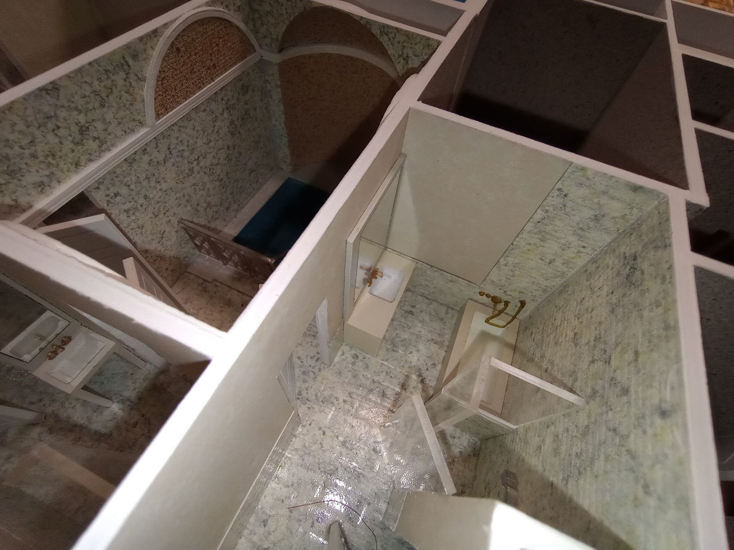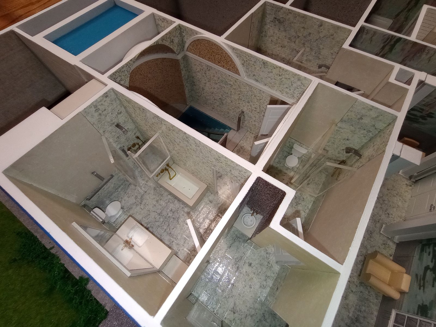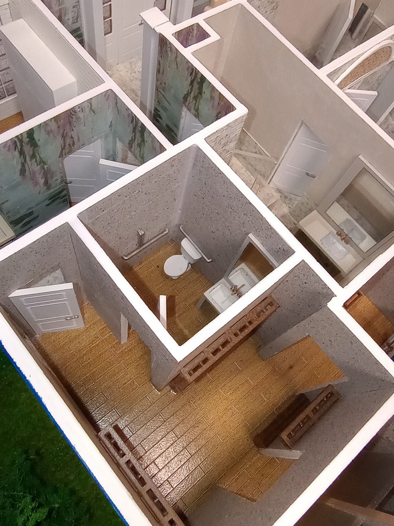 We are please to have completed for our client the highly detailed model of a Mikvah. There was no detail too small to be shown. Wallpaper and tile sized to meet scale. Reflecting mirrors animate the surrounding. Detailed exterior with lift off roof and landscaping, including duplication of signage.